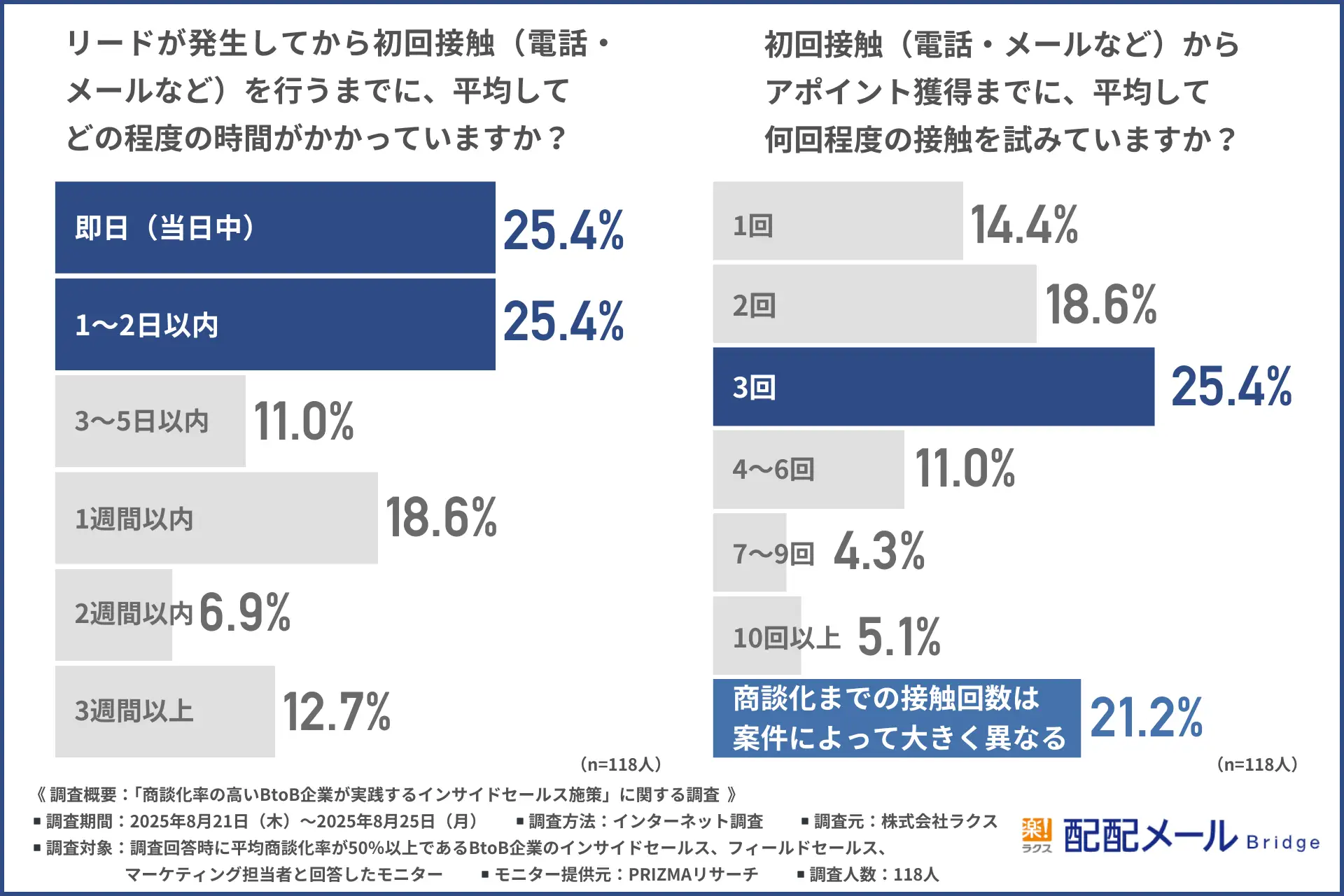 楽楽メールマーケティング(旧:配配メール)が実施した「成功企業のインサイドセールス施策実態調査」では、平均商談化率が50%を超えるBtoB企業の半数以上が、リード発生後当日~2日以内に初回接触をおこなっていることが明らかになりました。